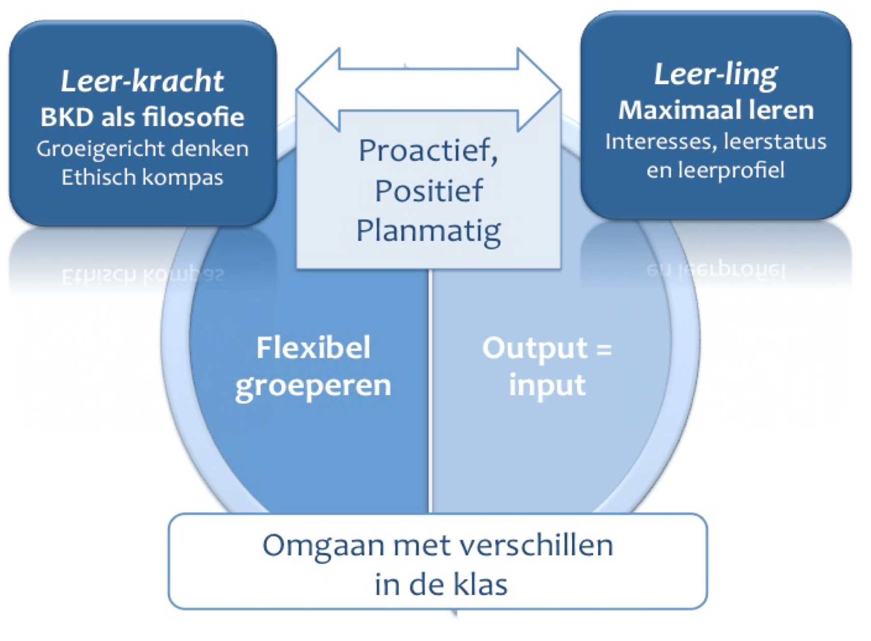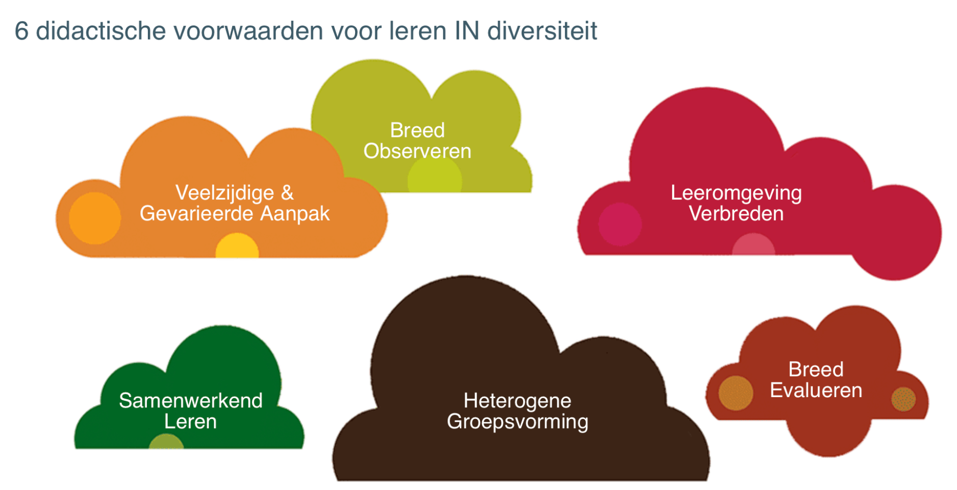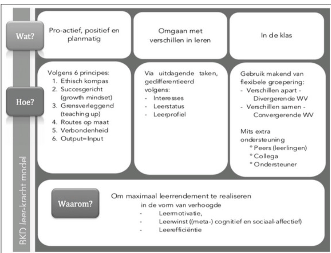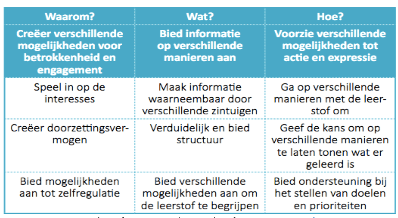 Een flexibele didactiek met verschillende werkvormen, rekening houden met zowel auditieve als visuele instructiestijlen, verscheidene materialen en differentiëren in tempo of niveau