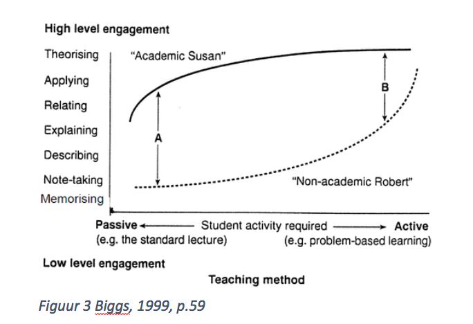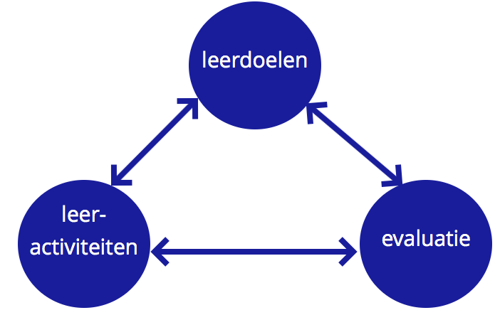De kernboodschap over "alignment" zit in de pijlen: Wat de student moeten kunnen (leerdoelen) is datgene wat ook moet getoetst worden (evaluatie) en dus datgene dat tijdens de leeractiviteiten aan bod moet komen.
